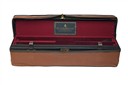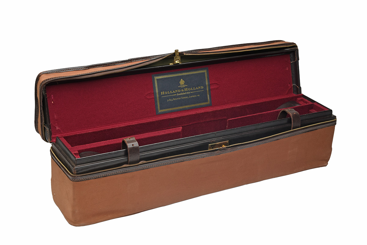 fitted for 28in. barrels, the interior lined with maroon baize, a Holland & Holland trade label, brass lock (key missing), canvas and leather outer