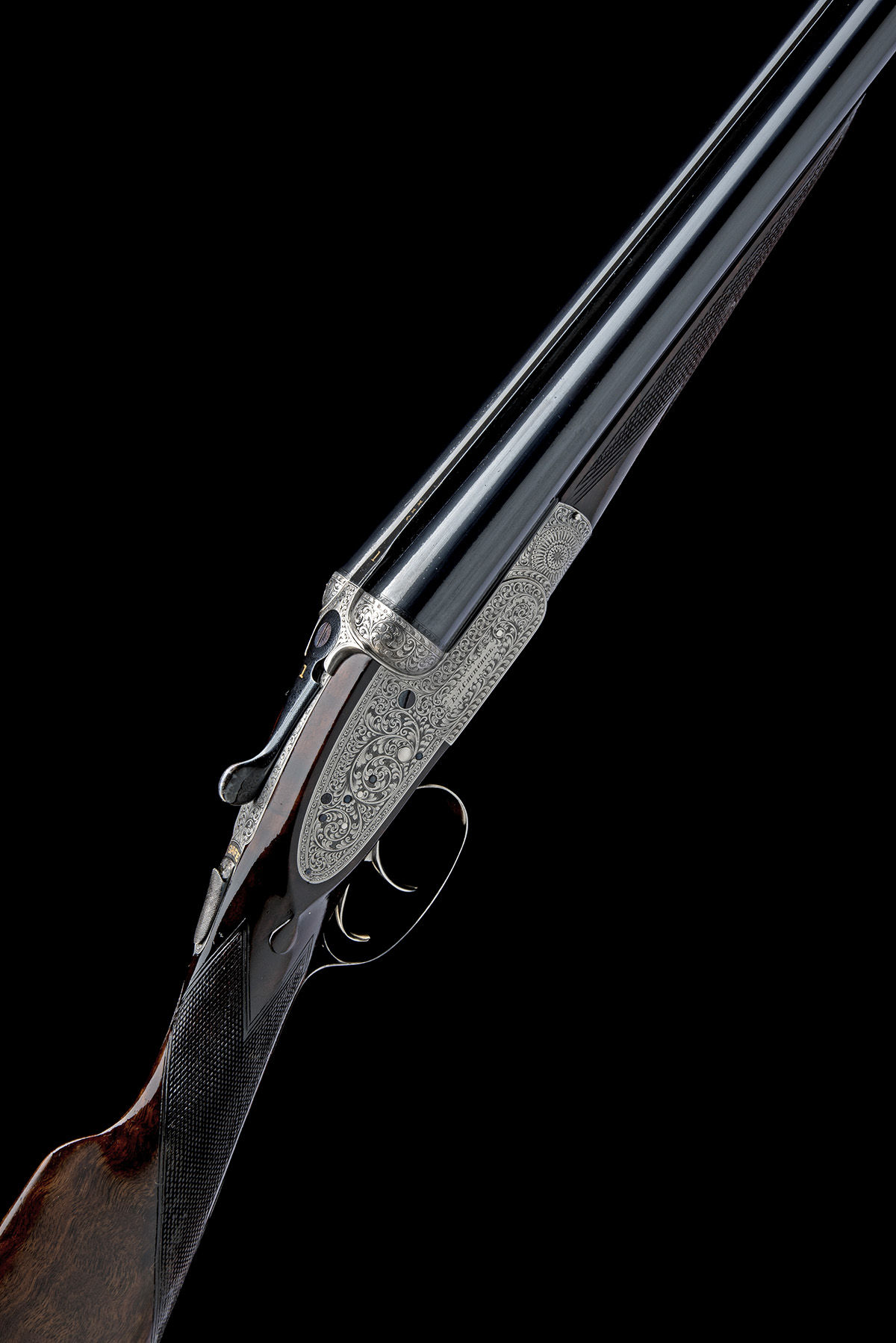 for 1929, 28in. sleeved nitro barrels (in 2011) with matt Churchill-rib, gold-inlaid 'XXV' and '1' at the breech end, the tubes engraved 'E. J. CHURCHILL (GUNMAKERS) LTD. ORANGE ST. GUNWORKS. LEICESTER SQUARE. LONDON.', 2 3/4in. chambers, bored approx. true cyl. and imp. cyl. choke, treble-grip action with hidden third bite, toplever gold-inlaid '1', automatic safety with gold-inlaid 'SAFE' detail, ornate border and bold acanthus scroll engraving, the underside gold-inlaid with an Imperial crown, brushed bright and reblued finish overall, 14 5/8in. figured stock including 1/2in. wooden extension and 7/8in. recoil pad, weight 6lb. 9oz.