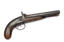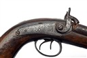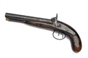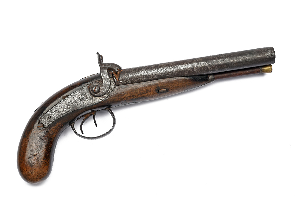 A .650 PERCUSSION DOUBLE-BARRELLED HOWDAH-PISTOL SIGNED MANTON, no visible serial number, circa 1850 and probably by Manton of Calcutta, with 7 3/4in. barrels (ribs separating, corroded), borderline engraved back-action locks and walnut full-stock with bag-shaped grip, worn throughout