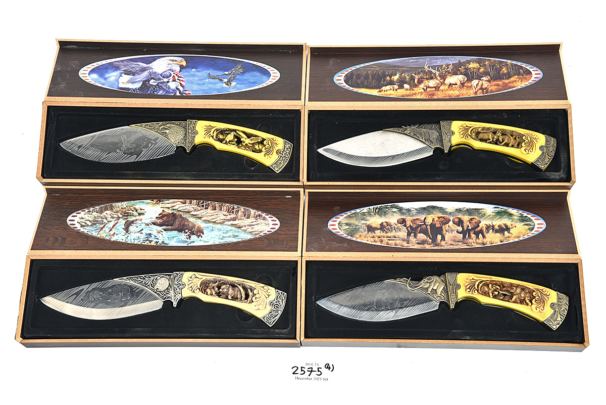 FOUR BOXED DECORATIVE DISPLAY HUNTING KNIVES, comprising of approx. 5in. drop point etched blade depicting a stag and doe, half tang, decorative alloy half guard bolster and pommel, resin scale handle with two stags rutting in wood display case, approx. 5in. drop point etched blade depicting a eagle, half tang, decorative alloy half guard bolster and pommel, resin scale handle with two eagles in wood display case, approx. 5in. drop point etched blade depicting a bear and cub, half tang, decorative alloy half guard bolster and pommel, resin scale handle with a bear and cub in wood display case, approx. 5in. drop point etched blade depicting an elephant and calf, half tang, decorative alloy half guard bolster and pommel, resin scale handle with elephant and calf in wood display case (4)