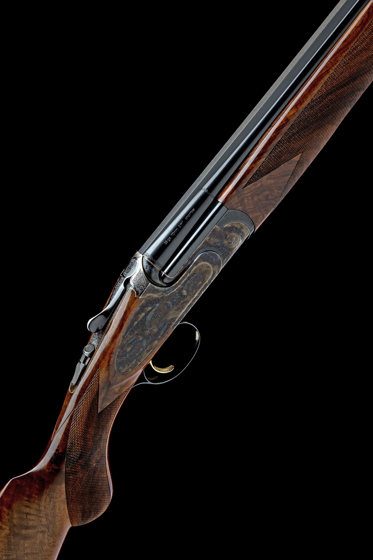 for 2009, 30in. nitro barrels with tapered solid matt top-rib, 2 3/4in. chambers, multichokes (with spares), hold-open toplever, manual safety with integral barrel selector switch, gold-washed trigger, bouquet and scroll engraving, the underside with the model designation in a scrolling banner, the triggerplate signed 'Bottega C. Giovanelli', retaining virtually full colour-hardening and finish, 14 5/8in. figured semi-pistolgrip stock including buttplate, weight 6lb. 11oz., with a leather gunslip