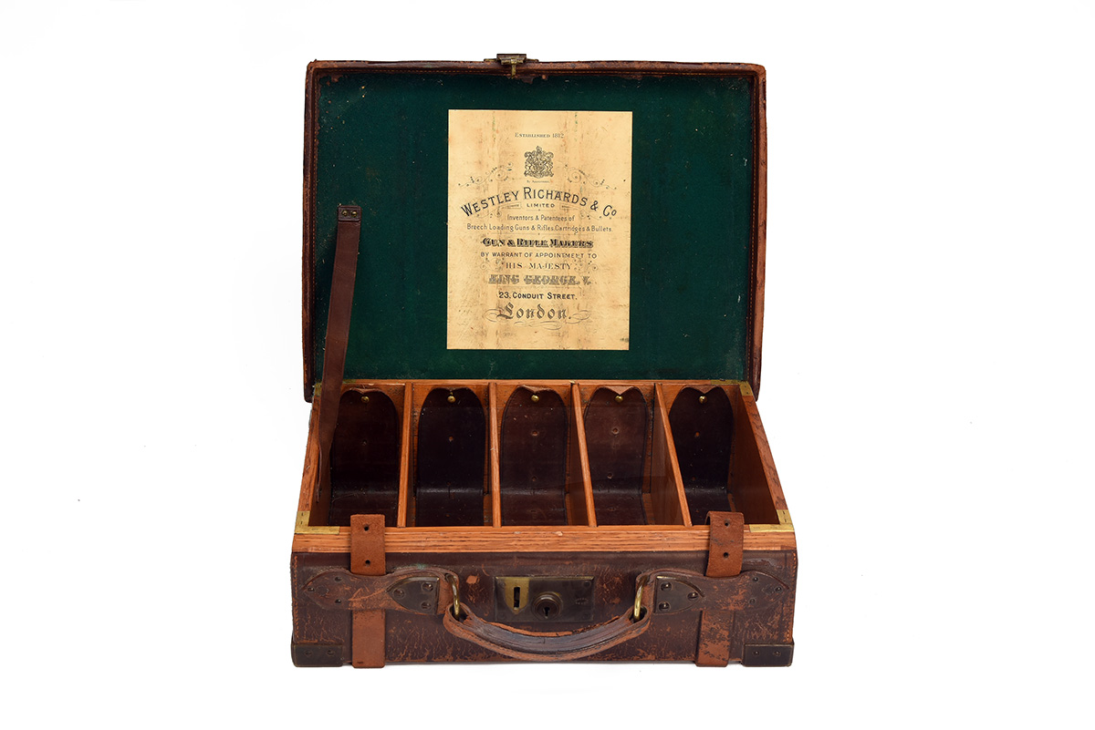 WESTLEY RICHARDS & CO. A BRASS-CORNERED OAK AND LEATHER CARTRIDGE MAGAZINE,