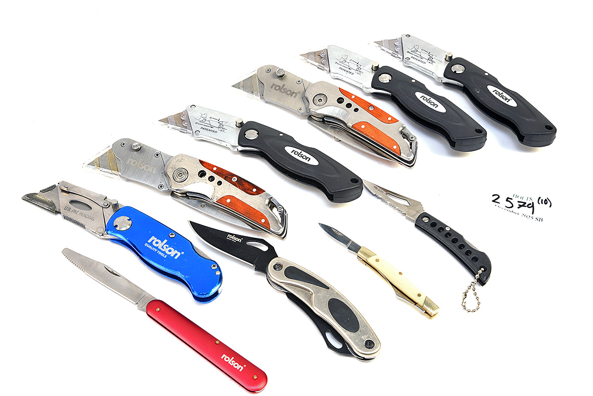 TEN LIGHTLY USED 'ROLSON' FOLDING KNIVES, comprising of 4 stanley style tradesman, 2 approx. 2 1/2in. drop point blade, stanley blade, steel wood scale handle, approx. 2 1/2in. trail point blade, saw, steel and rubber handle, approx. 2in. serrated blade, plastic handle, approx. 3in. rounded half serrated clip point blade, steel handle in red, approx. 1 3/4in., 1 1/2in. blades, nickel silver bolster and pommel, plastic scale handle (10)