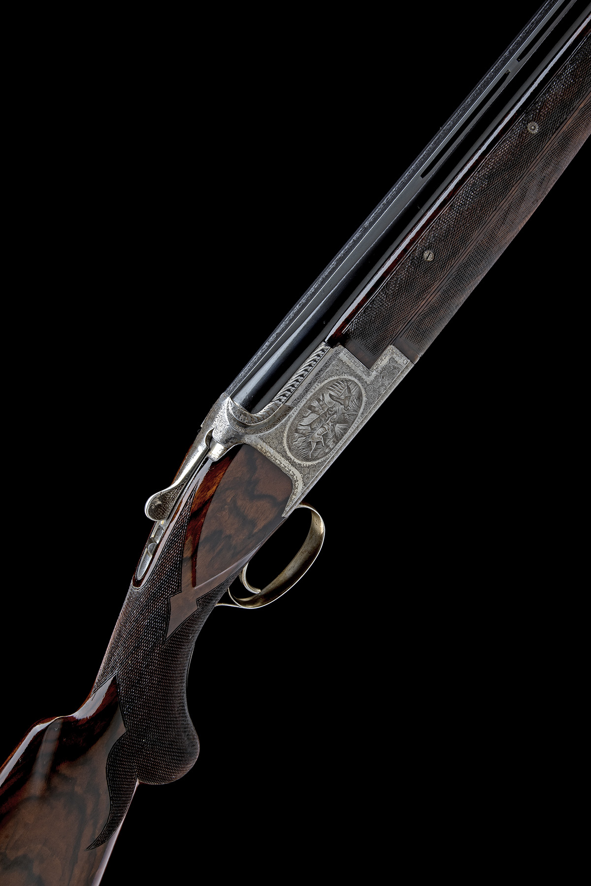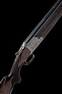 for 1973, 28in. nitro barrels with 12mm ventilated matt top-rib, 2 3/4in. chambers, bored approx. true cyl. in both, hold-open toplever, three-piece fore-end, manual safety with integral barrel selector switch and gold-inlaid 'O', 'U' and 'S' details, fine acanthus scroll engraving surrounding game scenes of hound and fowl, the flat engraved with the model designation and 'A. CUISSET', 16 1/4in. highly-figured replacement stock with ornate bordering to the chequering and including 2 1/4in. wooden extension, small fracture to triggerguard, weight 7lb. 13oz.