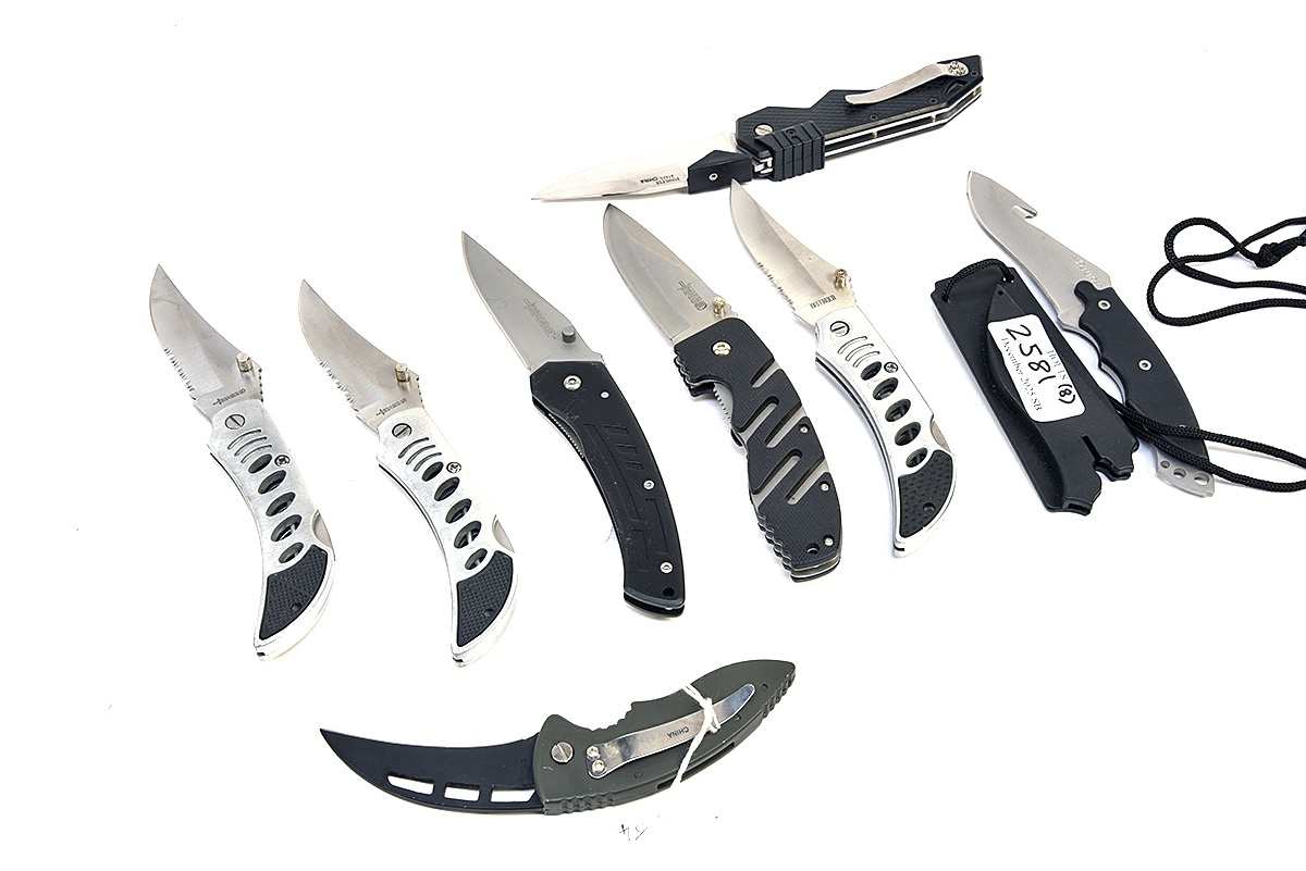 EIGHT LIGHTLY USED 'DEFENDER' HUNTING KNIVES, comprising of 3in. 440 stainless steel hooked fixed blade, full tang, black plastic scale handle, polymer sheath, 3 approx. 3in. stainless steel half serrated trail point blade, steel and rubber scale handle, belt clip, approx. 2 3/4in. black stainless steel talon blade, aluminium and rubber scale handle, belt clip, approx. 3in. 420 stainless steel, drop point blade, G-10 scale handle, belt clip, approx. 3in. 440 stainless steel drop point blade, black aluminium scale handle, approx. 3 1/2in. half serrated stainless steel drop point blade, black plastic scale handle (8)