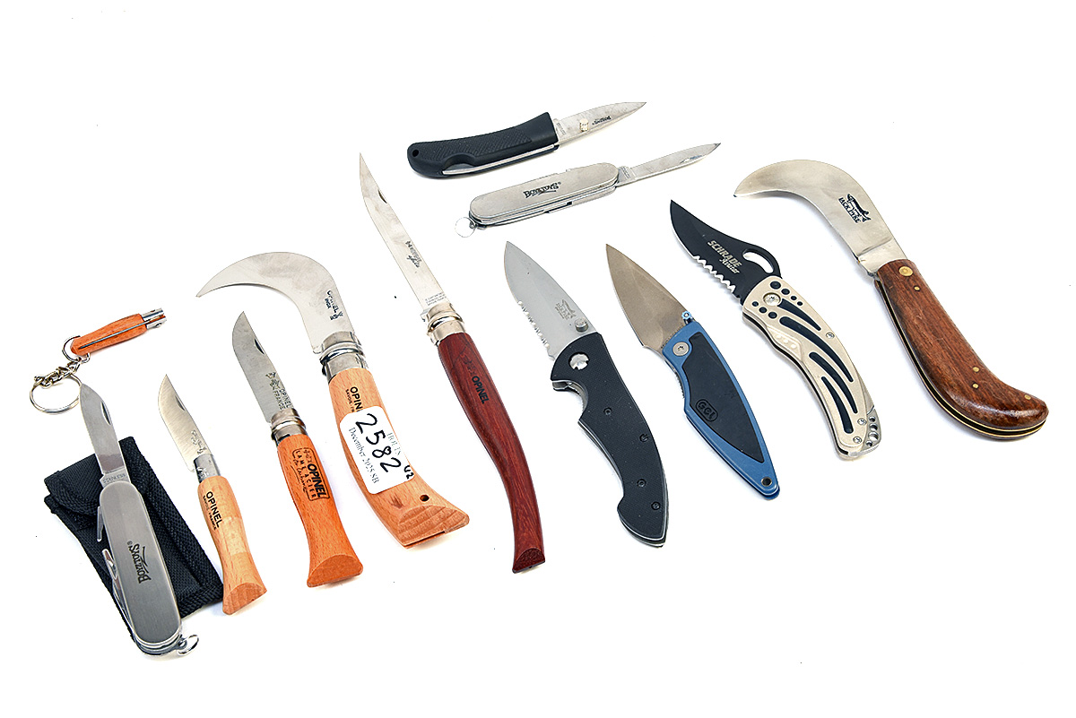 A QUANTITY OF 'OPINEL', JACK PYKE', 'BOYZ-TOYS' AND 'SCHRADE' FOLDING KNIVES, comprising of 'SCHRADE NITRO-BLUE' approx. 2 3/4in. drop point blade, blue aluminium and rubber scale handle, belt clip, 'SCHRADE AVATAR' approx. 3in. black half serrated trail point blade, aluminium and rubber scale handle, belt clip, 'JACK PYKE' approx. 3in. 440 stainless steel half serrated drop point blade, black G-10 scale handle, belt clip, 'JACK PYKE' approx. 3in. pruning blade, wood scale handle, 'OPINEL No.10' approx. 3in. pruning blade, wood handle, 'OPINEL EFFILE No.12' approx. 5in. skinning blade, wood handle, 'OPINEL No.6' approx. 2 3/4in. clip point blade, wood handle, 'OPINEL No.5' approx. 2 1/2in. clip point blade, wood handle, 'OPINEL No.2' approx. 1 1/4in. clip point blade, wood handle, keyring, 'BOYZ-TOYS' approx. 2 1/4in. drop point blade, rubber scale handle, 2 BOYZ-TOYS' approx. 2 1/2in. drop point blade golf divot multi-tool, steel scale handle (12)