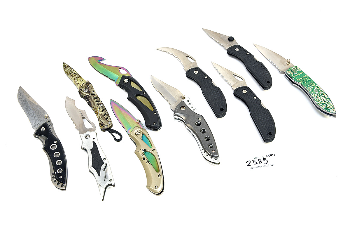 TEN UNSIGNED FOLDING KNIVES, comprising of approx. 2 3/4in. 440 stainless steel serrated leaf shape blade, plastic handle, belt clip, approx. 3in. serrated talon blade, plastic handle, belt clip, approx. 2 3/4in. half serrated leaf shaped blade, plastic handle, belt clip, approx. 3in. half serrated clip point blade, aluminium scale handle, belt clip, approx. 3in. drop point rainbow effect blade, aluminium scale handle, belt clip, approx. 3 1/4in. modified clip point blade, aluminium and rubber scale handle, belt clip, approx. 3 1/4in. half serrated wharncliffe blade, printed circuit board scale handle, belt clip, approx. 3in. half serrated hooked rainbow effect blade, black aluminium scale handle, belt clip, approx. 2 1/2in. drop point camo effect blade, steel camo effect handle, clip, approx. 3 1/4in. 440 stainless steel textured blade, black aluminium scale handle, belt clip (10)