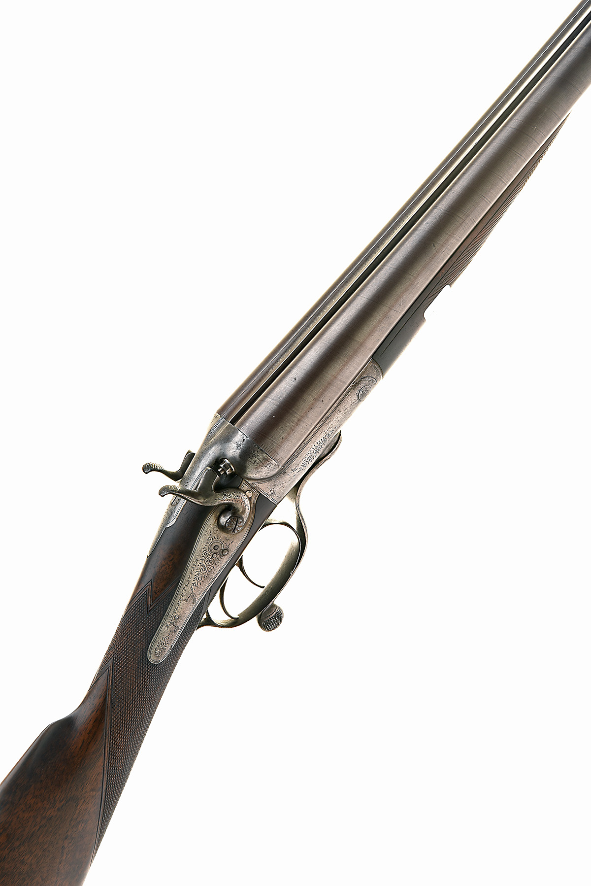 BENTLEY & PLAYFAIR 10-BORE (2 7/8IN.) ROTARY-UNDERLEVER HAMMERGUN, serial no. 55435, circa 1896, serial number on short rib only, 32in. black powder only damascus barrels, the rib engraved 'BENTLEY & PLAYFAIR. 60 QUEEN VICTORIA ST. LONDON.', 2 7/8in. chambers, bored approx. true cyl. and 1/4 choke, back-action locks with rebounding hammers, border and acanthus scroll engraving, patinated finish overall, 14 1/8in. figured stock including buttplate, weight 8lb. 3oz.