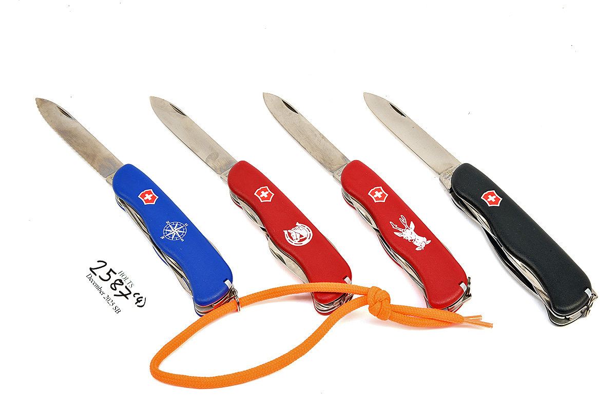 FOUR VIRTUALLY-UNUSED 'VICTORINOX' MULTI-TOOLS, comprising of 'HUNTER' approx. 3 1/2in. drop point blade, red scale handle with printed stag head, gutting blade, corkscrew, bottle and can opener, screwdriver, wire strippers, reamer, wood saw, tweezers, toothpick, keyring, 'PARACHUTIST' approx. 3 1/2in. drop point blade, black scale handle, belt cutter, corkscrew, bottle and can opener, philips screwdriver, reamer, tweezers, toothpick, keyring, 'MARINER' approx. 3 1/2in. serrated drop point blade, blue scale handle with printed compass, bottle and can opener, screwdrivers, reamer, shackle opener/ marlin spike tweezers, toothpick, paracord lanyard, keyring, 'EQUESTRIAN' approx. 3 1/2in. drop point blade, red scale handle with printed horse, corkscrew, can and bottle opener, screwdriver, reamer, wood saw, hoof cleaner, tweezers, toothpick, keyring (4)