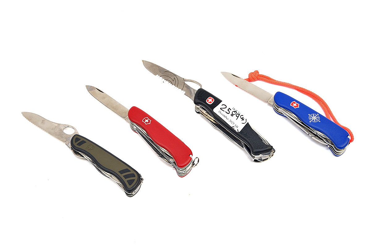 FOUR VIRTUALLY-UNUSED 'VICTORINOX' AND 'WENGER' MULTI-TOOLS, comprising of 'SKIPPER' approx. 3 1/2in serrated drop point blade, blue scale handle with printed compass, corkscrew, can and bottle opener, flat and philips screwdriver, wire stripper, reamer, combination pliers, wire cutters/crimper, shackle opener, tweezers, toothpick, paracord lanyard, keyring, 'WORK CHAMP' approx. 3 1/2in drop point blade, red scale handle, corkscrew, metal file and saw, can and bottle opener, flat and philips screwdriver, wire stripper, reamer, scissors, combination pliers, wire cutters/crimper tweezers, toothpick, keyring, 'SWISS SOLDIER; black and green scale handle, approx. 3 1/2in half serrated blade, can and bottle opener, wire stripper, flat and philips screwdriver, reamer, wood saw, keyring, 'WENGER ALINGHI' approx. 3 3/4in. half serrated blade, black scale handle, bottle and can opener, flat and philips screwdriver, pliers, awl, marlin spike/ruler, keyring (4)