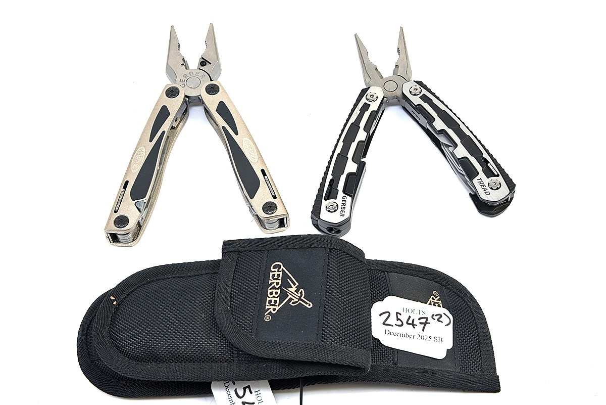 TWO VIRTUALLY-UNUSED 'GERBER' MULTI-TOOLS, 'GERBER MP800 LEGEND' approx. 2 3/4in. half serrated drop point blade, aluminium and rubber handle, pliers, remgrit saw with universal saw coupler, carbide wire strippers/ cutters, file, flat and philips screwdriver, fiskars scissors, bottle opener in makers nylon carry case, 'GERBER TREAD' approx. 2in. half serrated wharncliffe blade, aluminium handle, pliers, flat and phillips screwdriver, wire cutters, scissors, torch (untested) in makers nylon carry case (2)