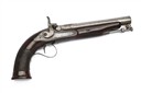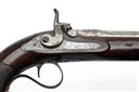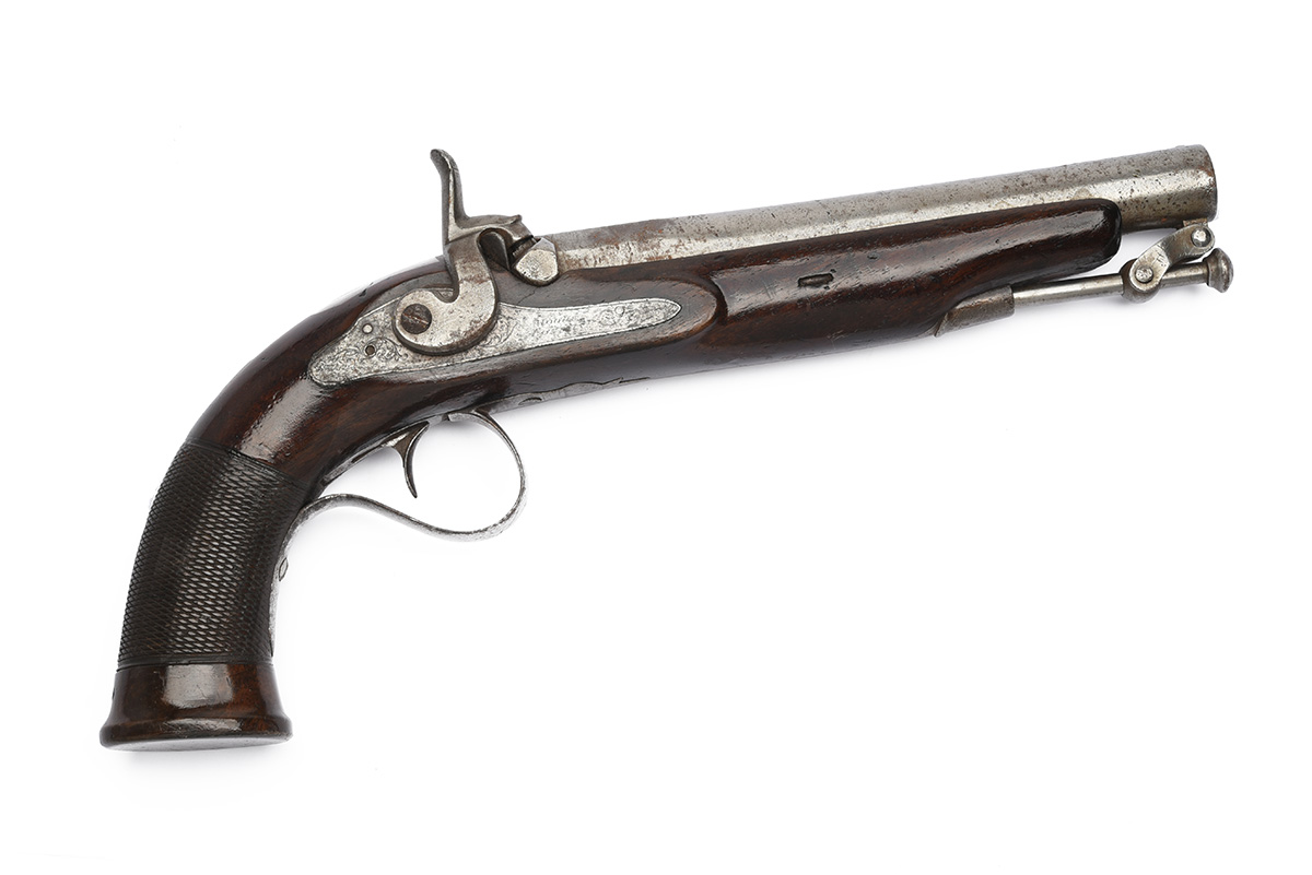A .680 PERCUSSION CAVALRY PISTOL SIGNED MOORE, LONDON, no visible serial number, circa 1845, with octagonal blending to round 8in. barrel, engraved top-tang, hump-backed bar-action lock signed 'MOORE, LONDON' (rubbed), walnut full-stock with chequered full grip and captive iron ramrod, worn throughout