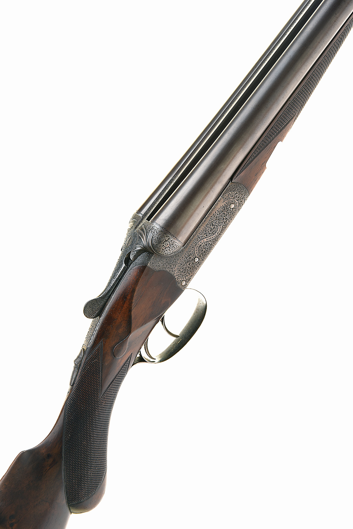 SAMUEL SMALLWOOD 12-BORE BOXLOCK EJECTOR, serial no. 3097, circa 1896, 29 3/4in. nitro reproved damascus barrels (in 1992), the rib engraved 'SAMUEL SMALLWOOD. 9. MILK STREET. SHREWSBURY.' (refreshed), and with acanthus scroll detailing at the breech-end, 2 1/2in. chambers, bored approx. 1/4 and 3/4 choke, scoop-backed treble-grip action, carved fences, automatic safety with gold-inlaid 'SAFE' detail, the action and furniture profusely engraved with bolt acanthus scrollwork, the makers name in a scrolling banner, retaining very slight traces of colour-hardening and finish, 14 1/4in. figured semi-pistolgrip stock with engraved steel heel and toe plates, weight 6lb. 10oz.