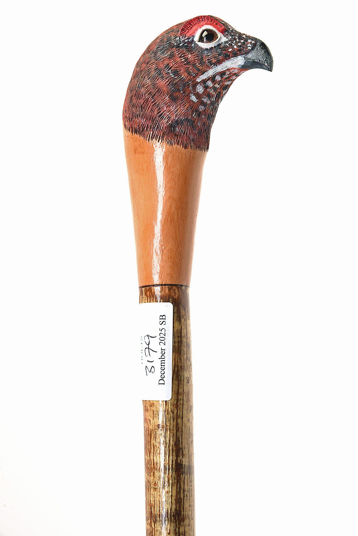 A MARK RICHARDS HAND-CARVED SPORTSMAN'S STAFF, with ashwood type shaft, the top carved in the form of a red grouse head, measuring approx. 50in. in length