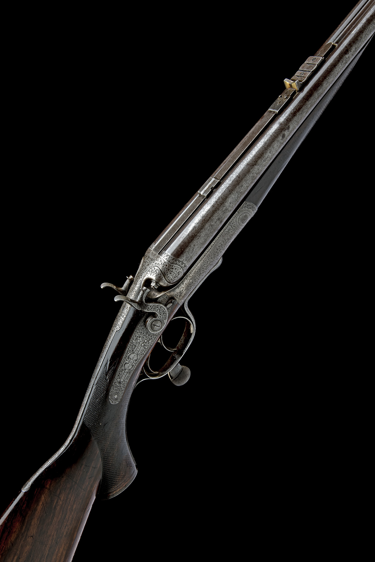 circa 1895, 28in. barrels proofed '.303 39 GRS RIFLEITE', matted sight rib with open sights with bone inserts and two folding leaf-sights, marked 200 and 300, telescopic sight mounts bases, ramp-mounted bead fore-sight, the tubes engraved 'HOLLAND & HOLLAND. 98. NEW BOND STREET. LONDON. WINNERS OF ALL THE "FIELD" RIFLE TRIALS. LONDON.', elongated action bar with Jones patent rotary underlever, carved percussion fences and side-clips, elongated top strap, rebounding back-action locks with bolted dolphin hammers, bold border and acanthus scroll engraving, the lockplates with 'HOLLAND & HOLLAND' in ornate cartouches, 14 1/2in. figured pistolgrip stock with cheekpiece, sling swivels and horn buttplate, engraved steel pistolgrip-cap, small gap from triggerguard tang to pistolgrip-cap (likely missing decorative insert), fore-end with Anson push rod release, weight