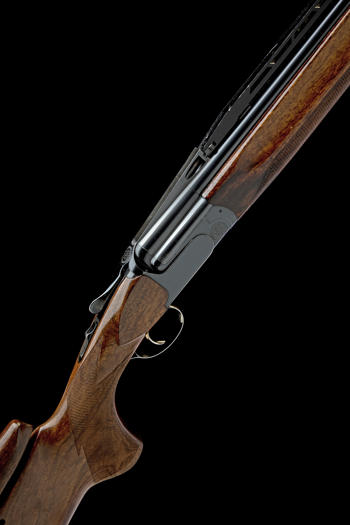 for 1993, 29 1/2in. nitro barrels with broad high adjustable ventilated matt top-rib, ventilated mid-rib, 2 3/4in. chambers, bored approx. 1/2 and 3/4 choke, hold-open toplever, manual safety with integral triggerplate release, plain blued finish, 14 3/8in. pistolgrip stock (minor grain split to rear of triggerguard) with adjustable comb and including 5/8in. rubber recoil pad (distressed), weight 8lb. 7oz., in its universal case