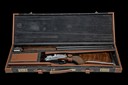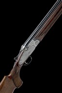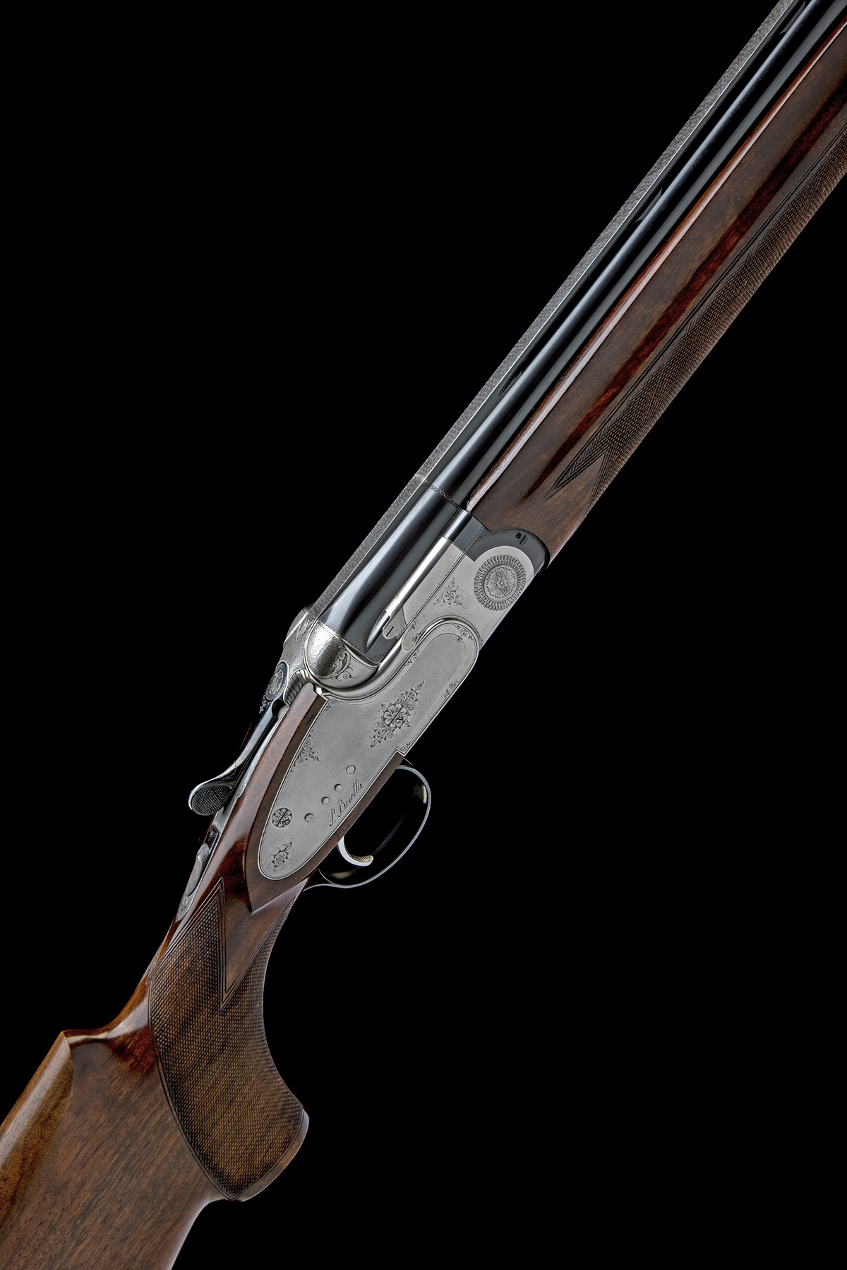 dated 1988, 29 1/2in. nitro barrels with 10mm ventilated matt top-rib, 2 3/4in. chambers, bored approx. 1/2 and full choke, hold-open toplever, manual safety, double rolled-edge triggerguard, border and partial scroll engraving, the underside gold-inlaid with the makers name, bright finish, 14in. pistolgrip stock with raised comb, including 1in. rubber recoil pad, weight 8lb. 7oz., in its makers universal case