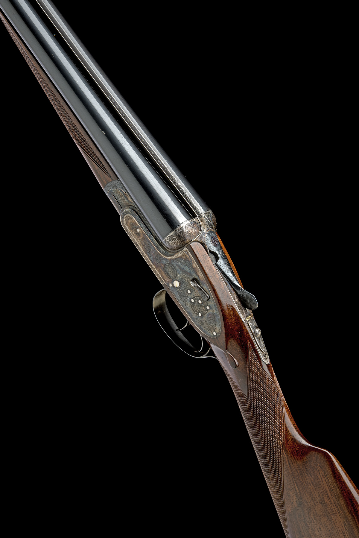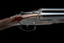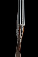 for 1981, 28in. nitro chopperlump barrels, 2 3/4in. chambers, bored approx. imp. cyl. and 1/2 choke, removable striker discs, automatic safety with gold-inlaid 'SAFE' detail, hand-detachable lockplates, gold-inlaid cocking-indicators, articulated front trigger, rolled-edge triggerguard, acanthus scroll engraving with floral bouquets, retaining much original colour-hardening and finish, 14 3/4in. stock, weight 6lb. 9oz.