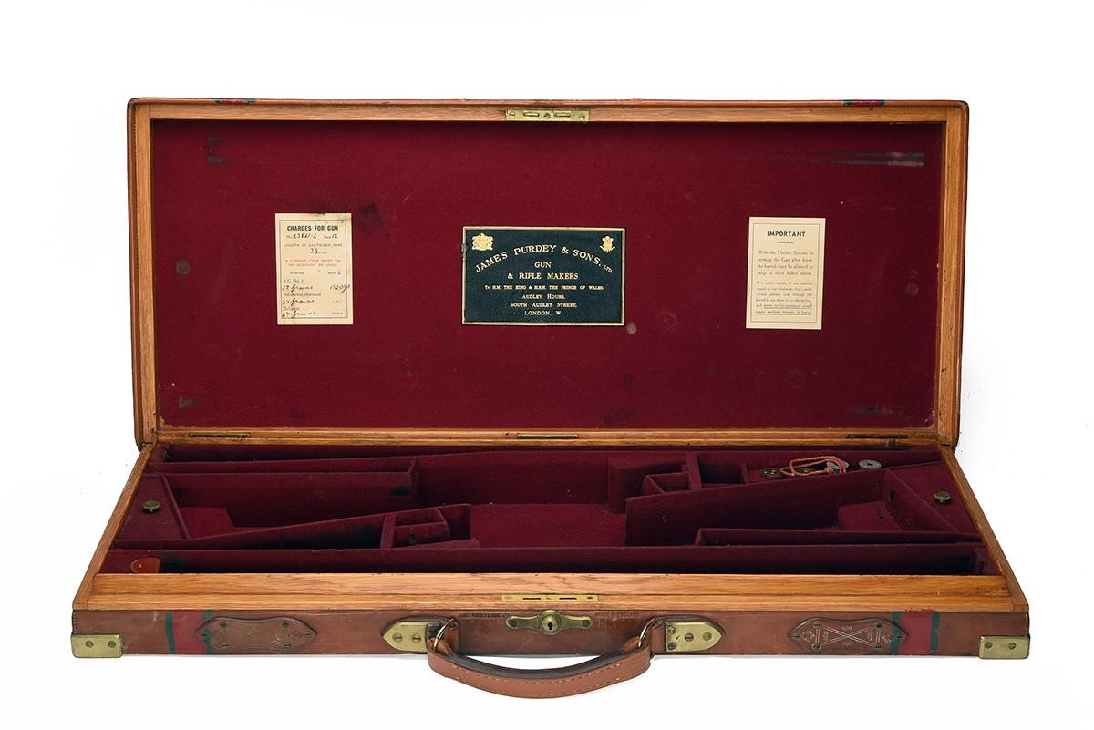 fitted for 28in. barrels (could adjust to 30in), the interior lined with maroon baize, a leather gold-tooled James Purdey & Sons Ltd. trade label, a Charges for Gun label (serial no. 23861/2), central brass push-button lock (including key), the lid exterior marked 'D.H.S.', central brass blank escutcheon
