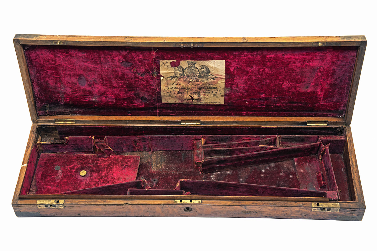 AN OAK CASE FOR A DOUBLE-BARRELLED PERCUSSION SPORTING GUN,