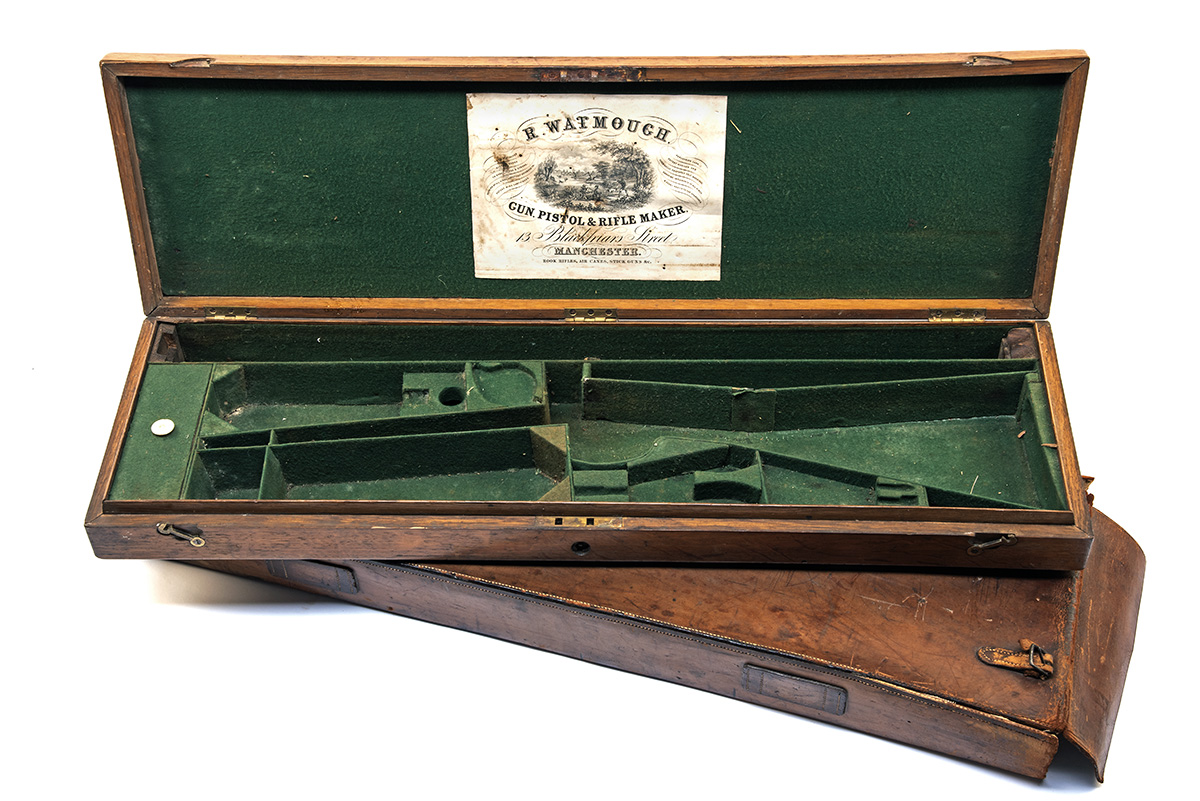 AN OAK GUNCASE FOR A PERCUSSION DOUBLE-BARRELLED SPORTING GUN WITH R. WATMOUGH, MANCHESTER LABEL,
