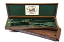 fitted for 30in. barrels with compartments for various accessories (absent), parchment trade label inside lid, compartmented and lined in green baize, with its outer leather protector (end flap and carry handle detached)