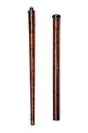 circa 1880, with 19 1/4in. tapering barrel section including detachable nose-cap, diminutive open sights, tap handle and aperture at breech, cocking keyway and concealed trigger to body and mating to a straight 17in. reservoir signed on the valve-face and with black horn bun pommel, the exterior retaining the majority of its original imitation malacca painted finish and together with its stirrup pump, the body signed 'W. WATSON & SON, 313 HIGH HOLBORN, LONDON'
