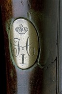 circa 1845, with plain round ribbon-twist 30in. browned two-groove barrel, applied blade fore-sight, elevating tangent rear-sight, knock-off breech, plain top-tang, borderline engraved back-action lock signed 'P.J. MALHERBE A' LIEGE' with border engraved hammer, walnut full-stock (cracked through and repaired at wrist), heavy brass furniture including patchbox (serial numbered inside lid), heel-plate (engraved with the double headed Russian Eagle and 'No 598'), oval escutcheon to wrist engraved with a crowned monogram, brass trigger-guard, the lower tang with finger-spur, two ramrod pipes and iron ramrod with brass cup tip, complete with iron stirrup swivels