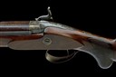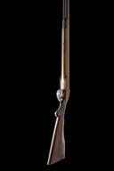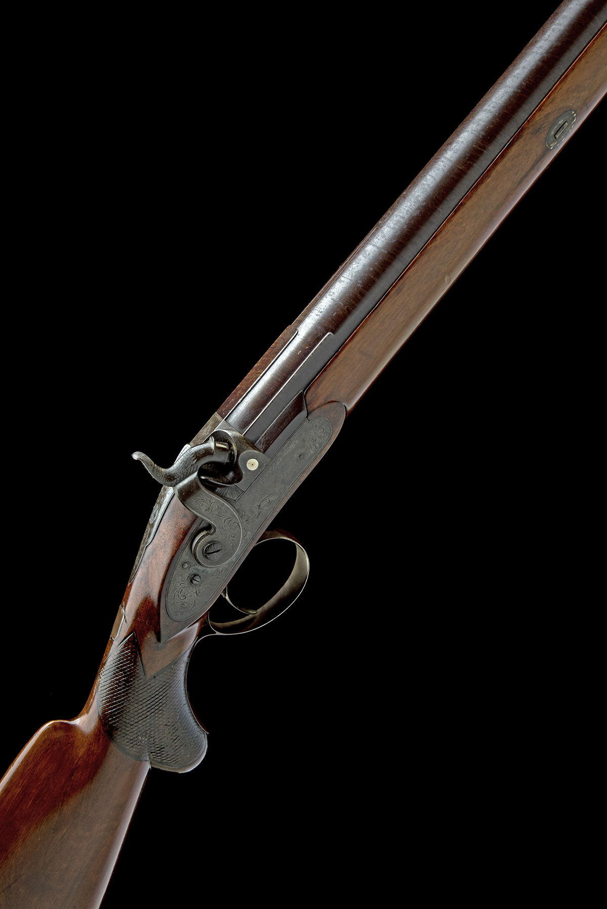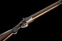 circa 1838, with round 46 1/2in. twist barrel (light external corrosion), the short rib at breech signed 'WESTLEY RICHARDS 170 NEW BOND ST. LONDON', bead fore-sight, squared breech with short moulded side-ribs, shallow sighting groove to the border and scroll engraved top-tang, colour hardened border and scroll engraved bar-action lock signed 'WESTLEY RICHARDS', en-suite dolphin-headed hammer, French-polished walnut half-stock with chequered semi pistol-grip and swept comb, iron furniture, the trigger guard bow with a scene of a dog and waterfowl and heavy duty under-barrel ramrod