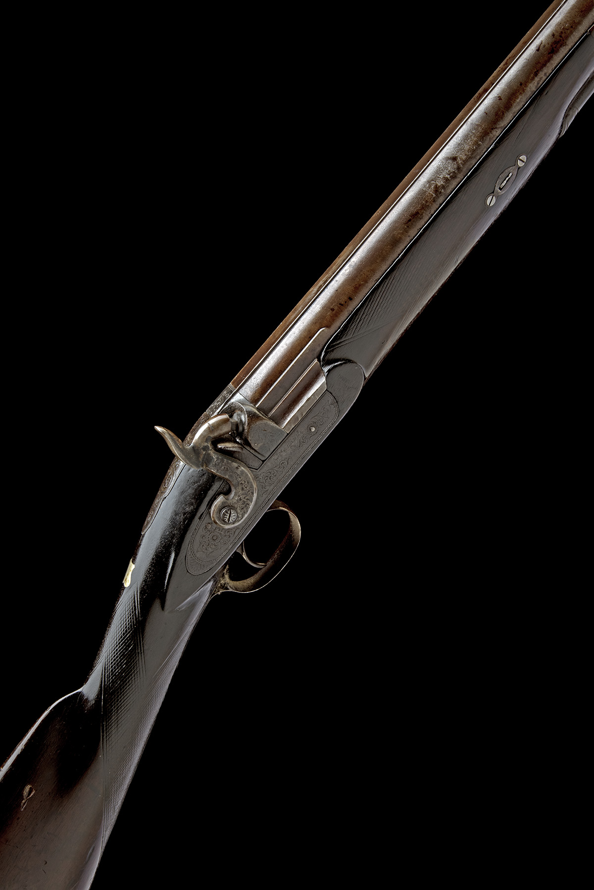 circa 1855, with round tapering 39in. barrel, raised slightly concave full-length sighting rib, scroll engraving to rib-end, bead fore-sight, border and scroll engraved top-tang, border and scroll engraved lock signed on the bar 'Wm CLARKE' (hammer with working repair to spur), chequered walnut half-stock (chequering rubbed), iron furniture, horn fore-end tip and under-barrel rib with ramrod (ramrod incomplete)