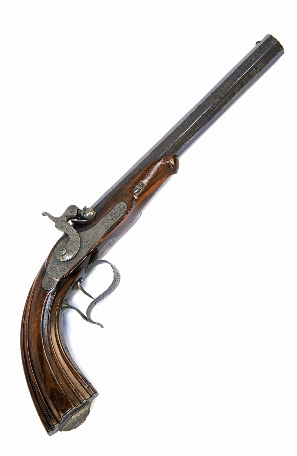 A 14mm FRENCH PERCUSSION RIFLED TARGET PISTOL SIGNED AURY, no visible serial number,