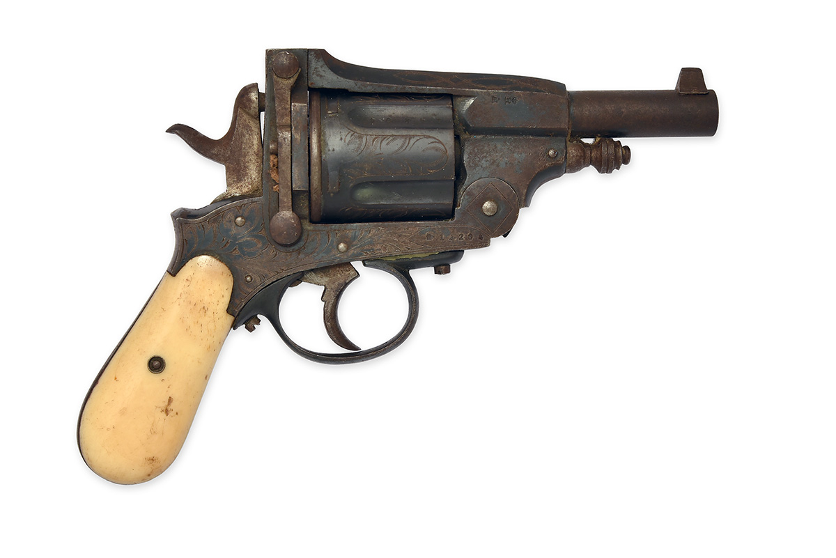 circa 1875, with round 3 3/4in. barrel, pinched blade fore-sight, no provision for rear-sight, break-open frame locked by twin 'Pryse'-bars and signed on the barrel-throat 'DASSEN PATENT' over 'GUSS-STAHL', a crown above 'G.M.' and a crossed keys device above hinge, the front left of frame body with 'L.G.' bisected by a stylised Liege pillar mark above 'SCHUTZ MARK', crude floral engraving repeated above each chamber on the elongated five-shot cylinder, full ring type ejector, double action mechanism and smooth bag-shaped bone grips, traces of finish