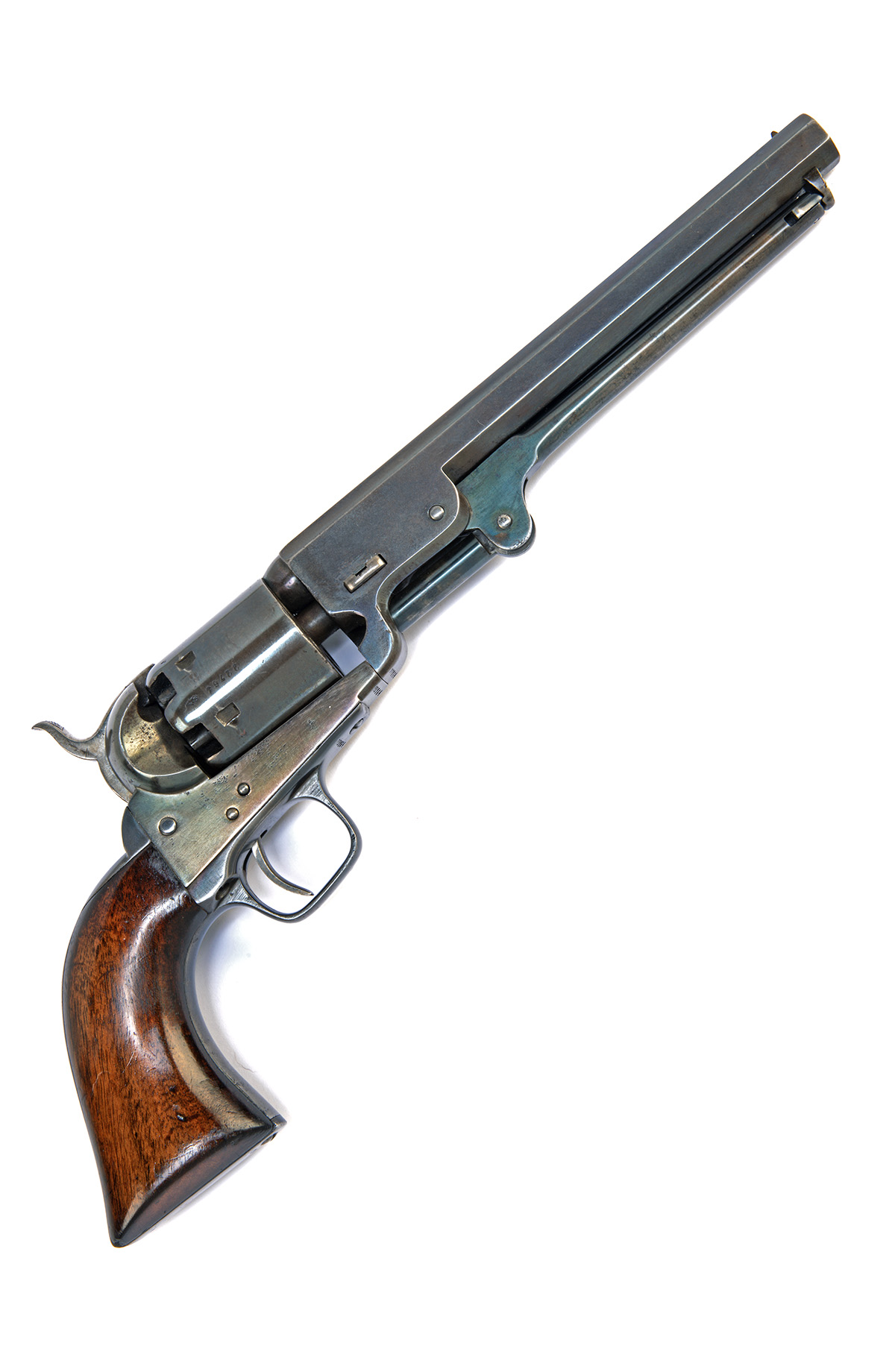 for 1855, with octagonal 7 1/2in. barrel signed 'ADDRESS COL COLT LONDON' on the top flat, with traces of London proof marks and a broad arrow stamp (rubbed), open iron frame marked 'COLT'S PATENT', six shot cylinder with London proof marks (scrubbed of scene), iron trigger-guard and backstrap, smooth flared one piece walnut grip, under barrel loading lever, with all matching serial numbers, the whole re-finished throughout