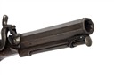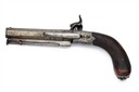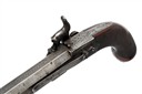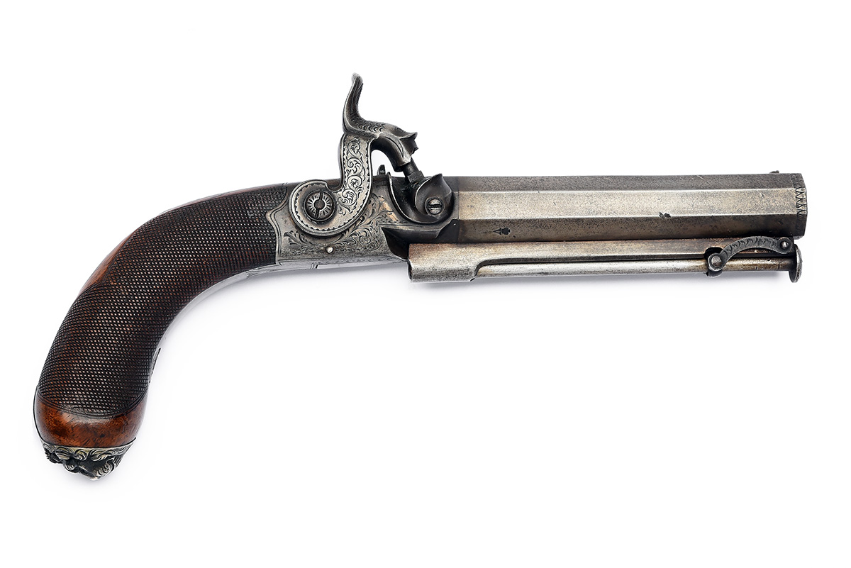 circa 1840, with rifled octagonal 4in. barrel signed on the top flat 'MANTON LONDON', Birmingham and London proof marks to underside, scroll engraved boxlock action with radiused edges and traces of original finish, engraved side hammer (flash-guard chipped), finely chequered walnut grip with vacant oval escutcheon and white metal lion mask pommel-cap, concealed automatic trigger and captive under-barrel iron ramrod, with a spring steel belt hook to the left side