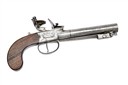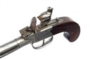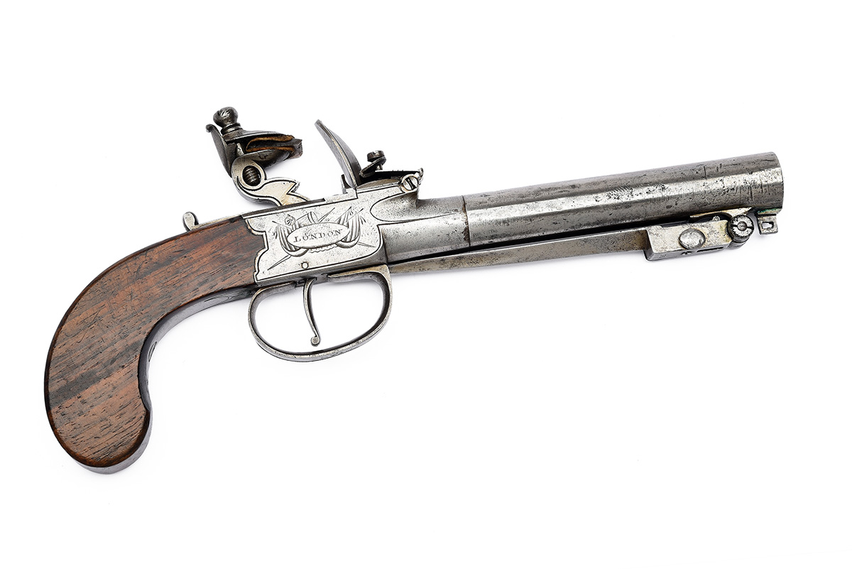 A 36-BORE FLINTLOCK TURN-OFF PISTOL WITH SPRUNG BAYONET, SIGNED SHARPE, no visible serial number,