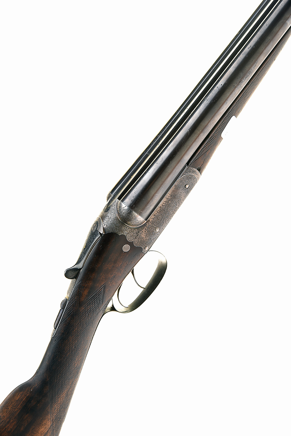 WESTLEY RICHARDS 12-BORE BOXLOCK EJECTOR, serial no. 14736, circa 1890, 28in. sleeved nitro barrels, rib gold-inlaid '2', 2 1/2in. chambers, bored approx. imp. cyl. and 1/4 choke, scroll-back treble-grip action, toplever gold-inlaid '2', automatic safety with gold-inlaid 'SAFE' detail, border and acanthus scroll engraving, retaining traces of original colour-hardening and finish, 14 1/4in. figured stock (pinned at head) with steel heel and toe plates, weight 6lb. 9oz.