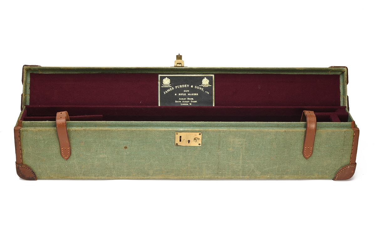 fitted for 28in. barrels, the interior lined with maroon baize, a leather James Purdey & Sons trade label, brass lock (including key)
