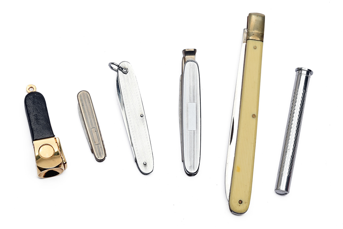 TWO 'RICHARDS OF SHEFFIELD' POCKET KNIVES AND RELATED ITEMS, smokers knife approx. 2in. round tip blade, stainless steel scale handle, poker and tobacco packer, approx. 1 1/4in. drop point blade, stainless steel scale, unsigned approx. 2 1/4in. drop point blade, stainless steel scale, unsigned smokers tool, 'PFEILRING SOLINGEN' cigar cutter, 'SOLINGEN' approx. 4 1/2in. drop point blade, nickel silver bolster, plastic scale handle