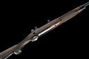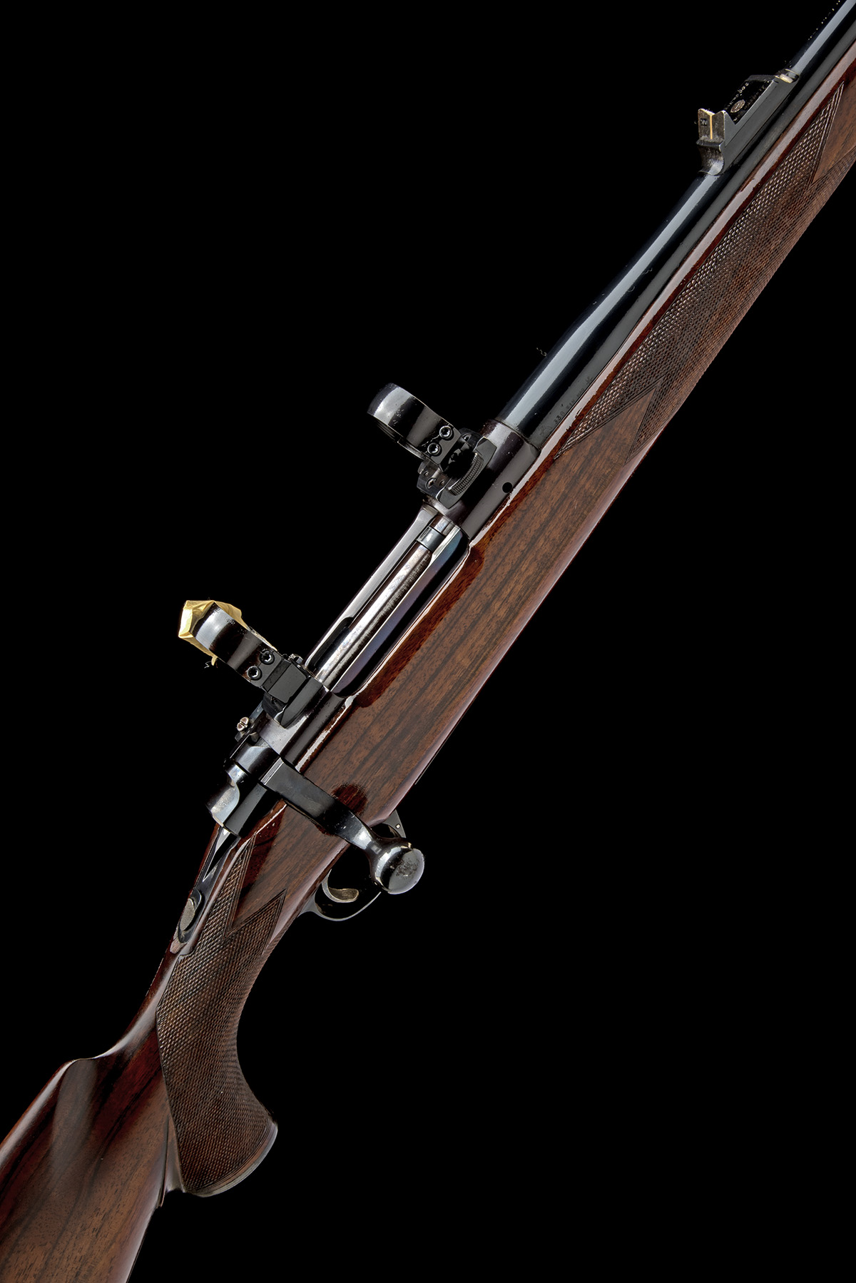 for 1989, 24in. nitro barrel engraved 'GEORGE GIBBS (EST. BRISTOL, 1830) 37, BROAD ST. BATH. ENGLAND', block mounted open sights with matted front, gold-inlaid sightline and marked '100', the plate engraved 'SIGHTED FOR 200 GR BULLET', ramp-mounted bead fore-sight, the receiver mounted with 30mm rings in quickly-detachable mounts, manual tang safety, hinged floorplate engraved 'GEORGE GIBBS .338 WIN. MAG.' and with push button release, well-figured pistolgrip stock with cheekpiece, skeletal steel pistolgrip-cap, sling eyes (front eye missing), rolled-edge triggerguard engraved with the serial number, blued hinged ammunition trap gold monogrammed 'NF' in a circle, 14 1/4in. pull including 5/8in. leather covered recoil pad, weight 8lb. 13oz.