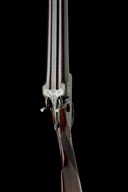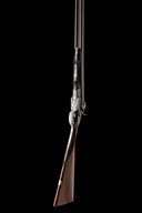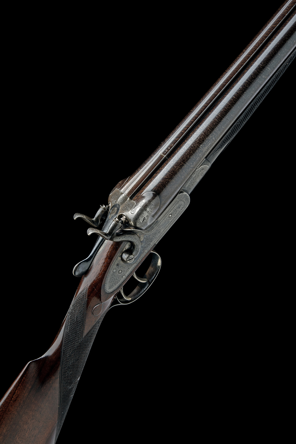 circa 1876, 27 3/8in. slightly shortened bold twist nitro reproved barrels, the rib engraved 'W. & C. SCOTT & SON. MAKERS AND PATENTEES 10 CASTLE STREET. REGENT CIRCUS. LONDON' (rubbed and with illegible pre-address inscription) and with a later stamped '433' and 'EBL' shield at the breech end, 2 1/2in. chambers, bored approx. true cyl. in both, W. M. Scott patent quadruple-grip action, patent no. 186 of 18th January 1875, extended standing breech with carved percussion fences with opposing crossbolts, Purdey double bite snap, patent no. 1104 of 2nd May 1863, use number 6579, rebounding sidelocks, fine acanthus scroll engraving with some beaded bordering, retaining traces of colour-hardening, 14 1/2in. replacement stock, the fore-end with W. M. Scott patent 'key' fore-end release, patent no. 3756 of 1873, weight 7lb. 10oz.