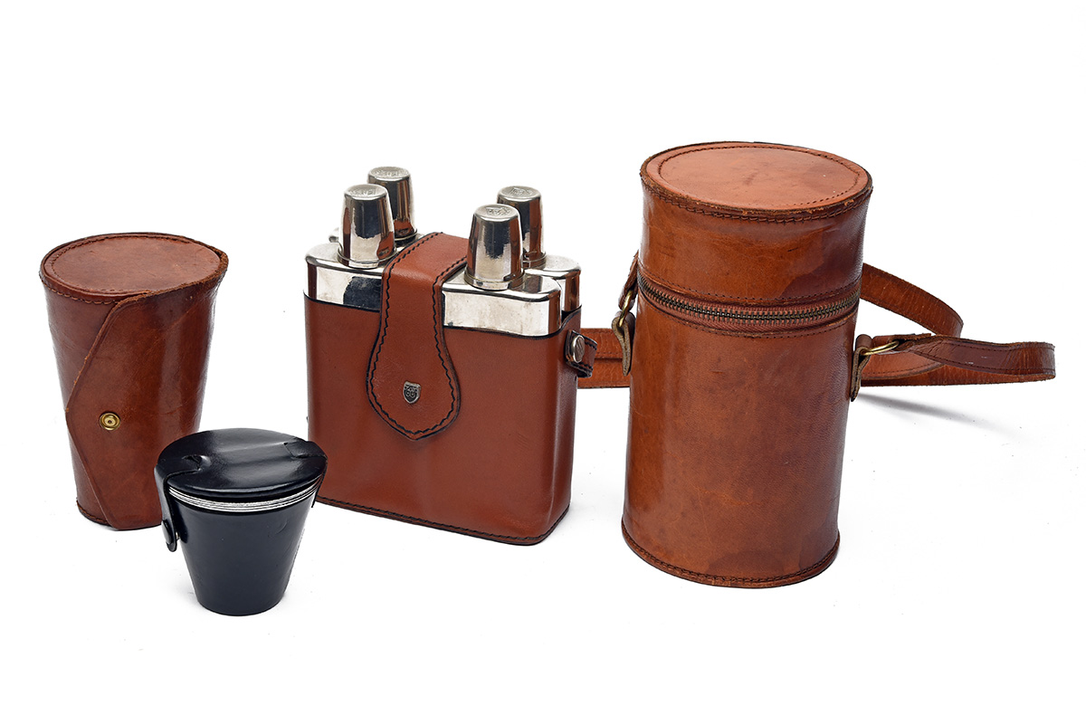 A QUANTITY OF TRAVEL HIP FLASKS AND DRINKING CUPS, a German made 4-piece stainless-steel and plastic hip flask set in leather carry case, a 3-piece hip flask set and 4 shot glasses in leather carry case, (glass flask not original), 2 stainless steel 18/8 drinking cups in leather case, 'VANTAGE' 4-piece shot glasses in leather case, 4-piece drinking cups in leather case (5)