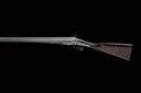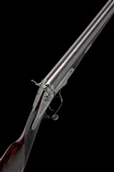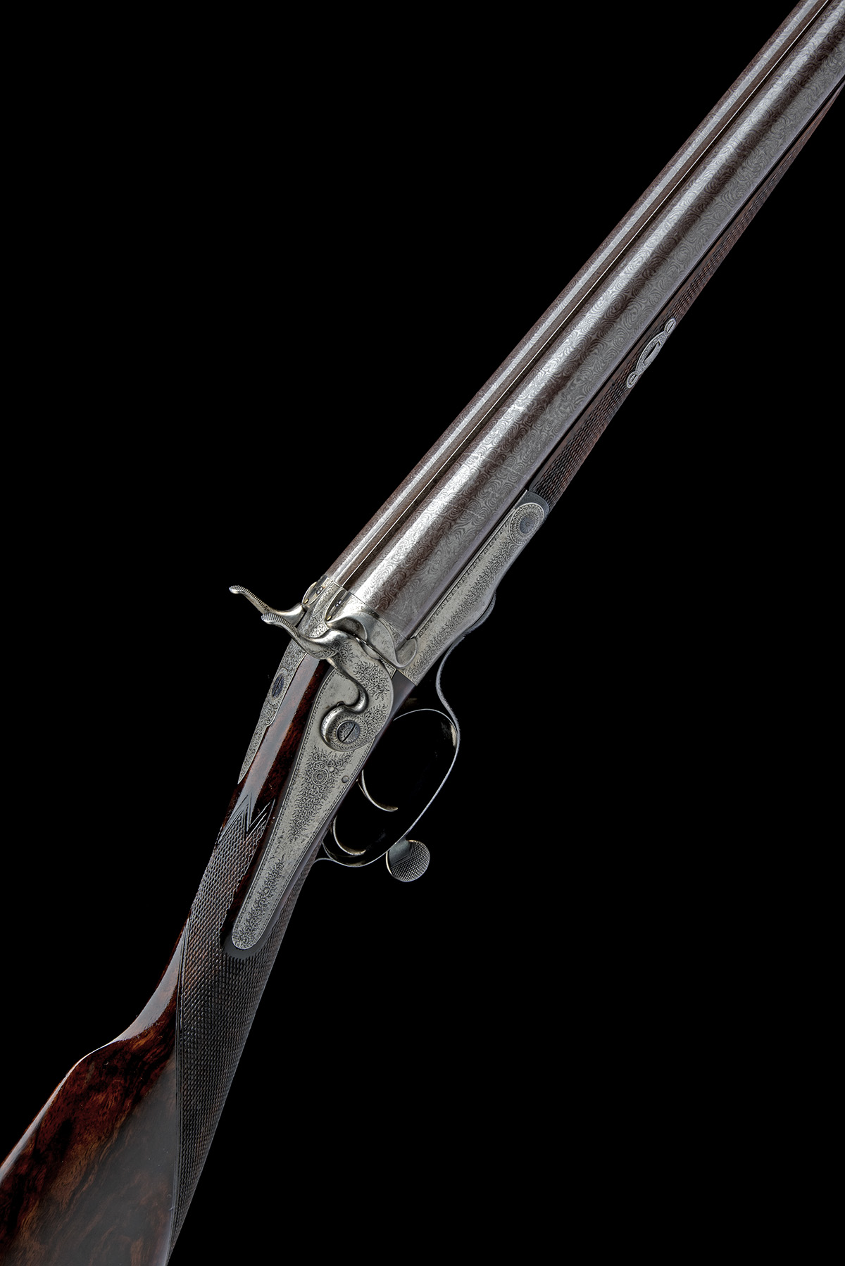 for 1866, 29 1/4in. nitro reproved bold damascus barrels (in 2011, wall thicknesses well below recommended minimum), rib engraving indistinct, 2 3/4in. chambers, bored approx. true cyl. in both, Jones-patent rotary underlever, carved serpentine fences, action incorporating Purdey patent No. 424 of 1865, non-rebounding back-action locks with hammers of hare's ear form with linked strikers, Purdey patent cocking-indicators, patent No. 1464 of 1866, fine border and acanthus scroll engraving, brushed bright, 13 3/4in. figured stock including buttplate, weight 6lb. 3oz.