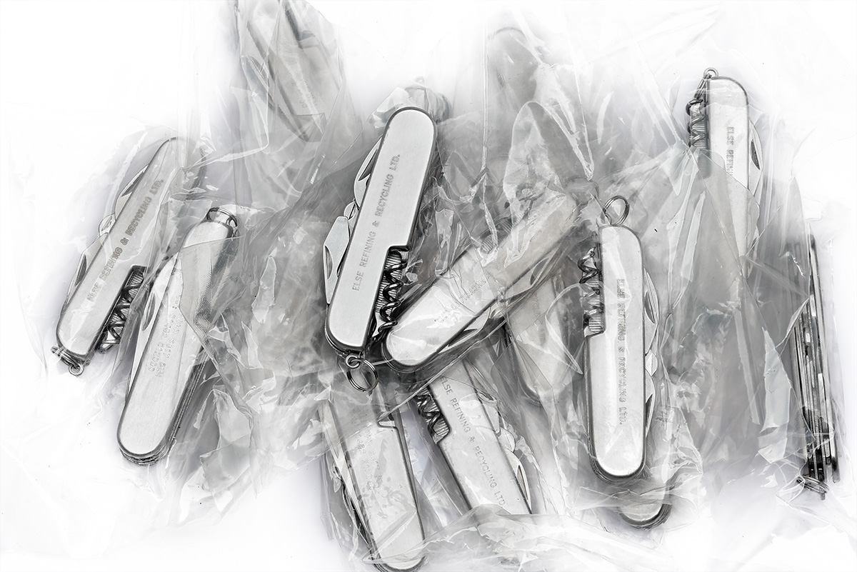 FIFTEEN UNUSED PROMOTIONAL MULTI-TOOLS, approx. 2in. drop point blade, stainless steel scale handle reading ' ELSE REFINING & RECYCLING LTD' scissors bottle and can opener, flat and philips screwdriver, corkscrew, file keyring (15)