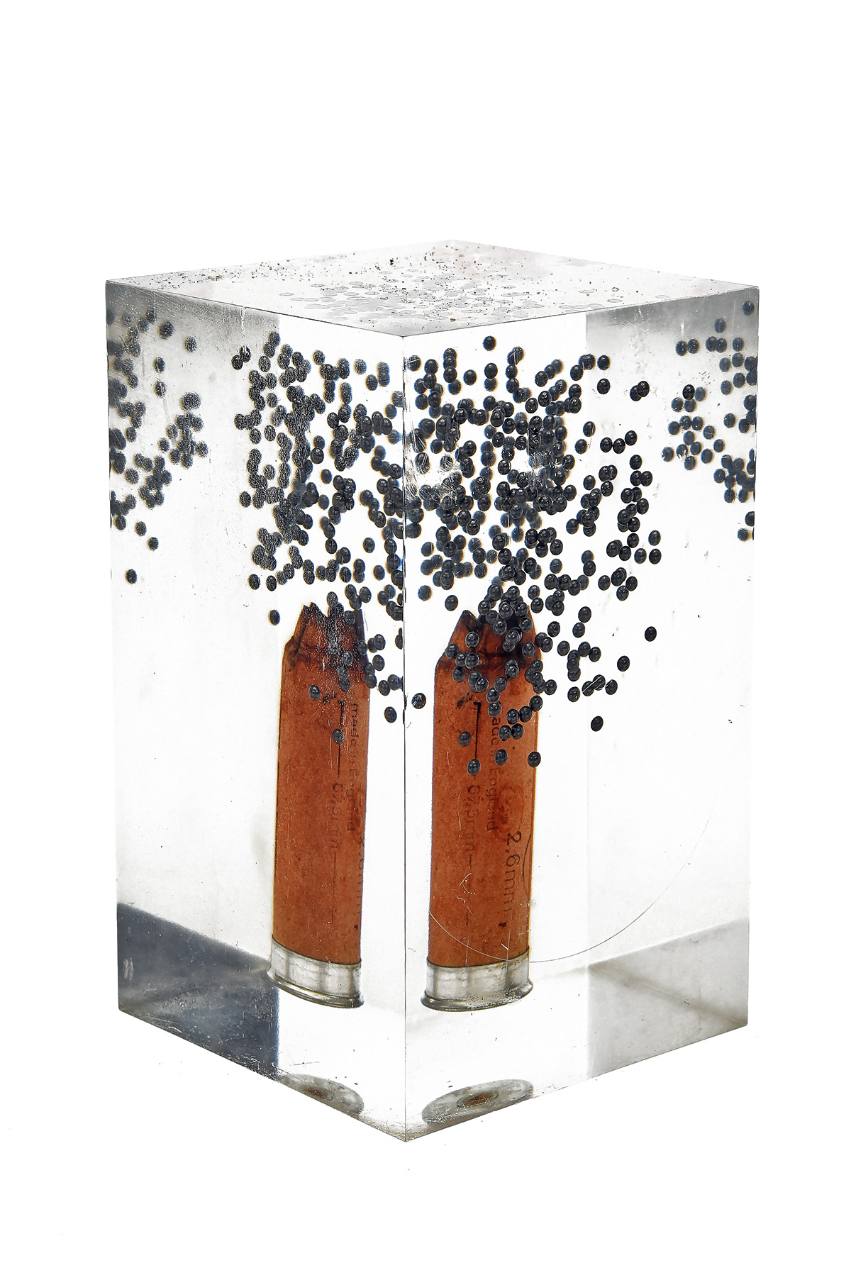 A PAPER-WEIGHT OF AN OPENED 12-BORE 'ELEY' PAPER CARTRIDGE WITH SHOT STRING, in clear resin