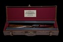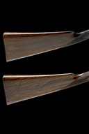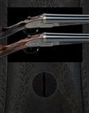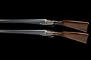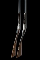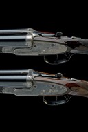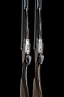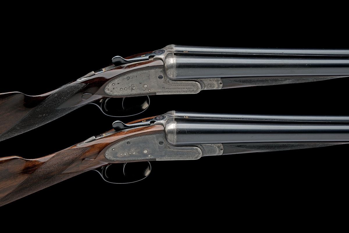 for 1935/6, 28in. nitro chopperlump barrels, ribs engraved 'WILLIAM POWELL & SON (GUNMAKERS) LTD. 35 CARR'S LANE. BIRMINGHAM.' and gold-inlaid '1' and '2', 2 1/2in. chambers, bored approx. imp. cyl. and 1/2 choke, toplevers gold-inlaid '1' and '2', automatic safeties with gold-inlaid 'SAFE' details, border engraving, retaining some original colour-hardening, locks and furniture swept, 15in. stocks cast for central vision (right shoulder, left eye), No.2 a replacement, weight 6lb. 7oz. (No.1) and 6lb. 9oz. (No.2), in a leather motor case