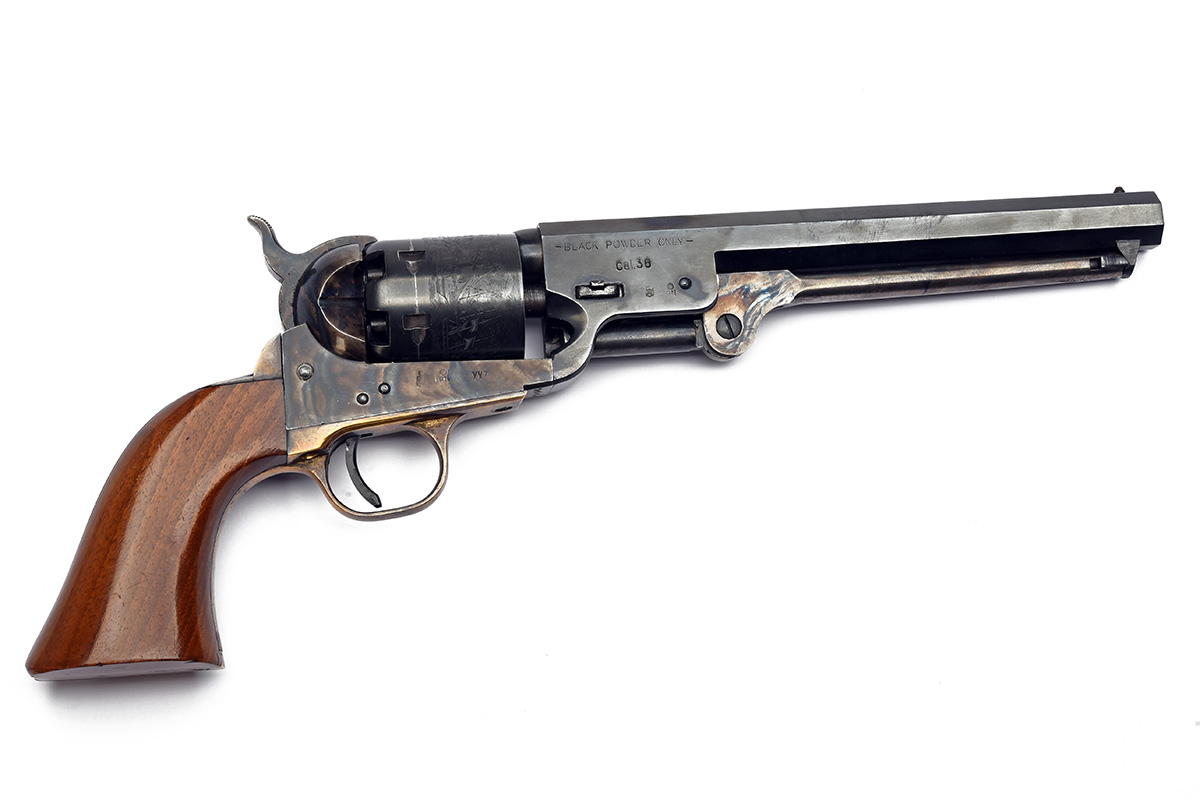 A REPRODUCTION .36 PERCUSSION 'WESTERNERS ARMS' REVOLVER MODEL 'COLT NAVY', serial no. 10993, with 7 1/2in. blued octagonal barrel, colour hardened open frame and ram rod, blued engraved cylinder, brass trigger guard and grip-straps smooth walnut grips