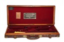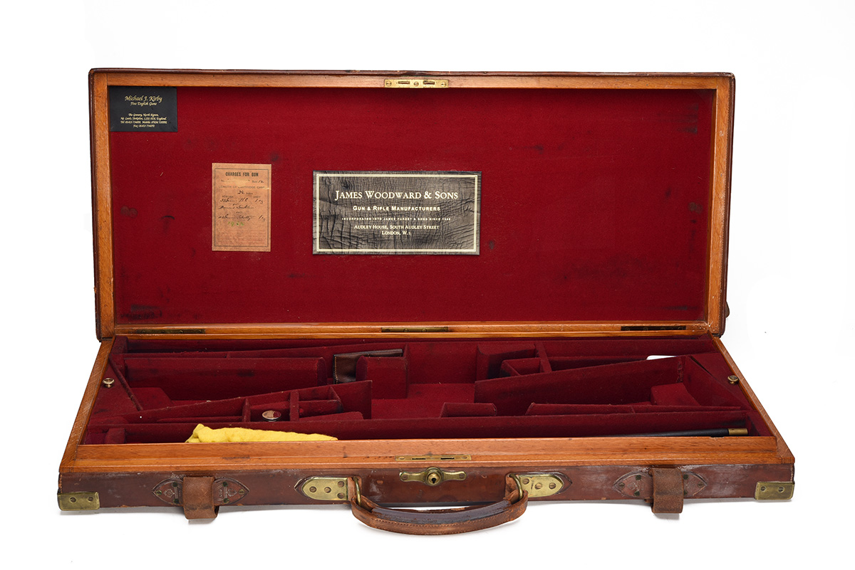fitted for 28in. barrels (could adapt to 30in.), the interior lined with red baize, a leather James Woodward & Sons trade label, a 'Charges for Gun' label (serial number rubbed out), two-piece cleaning rod, oil bottle, two pairs of 12-bore snapcaps, turn screw, central brass push-button lock (key missing), the lid exterior with a brass plaque marked 'R.A.J.' and a central blank brass escutcheon