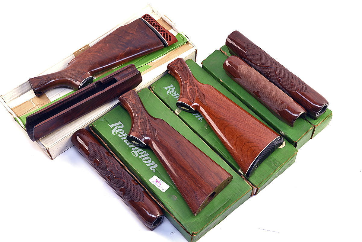 THREE WOODEN STOCKS AND FOUR FORE-ENDS FOR REMINGTON MODEL 1100 SHOTGUNS, mostly in their original boxes