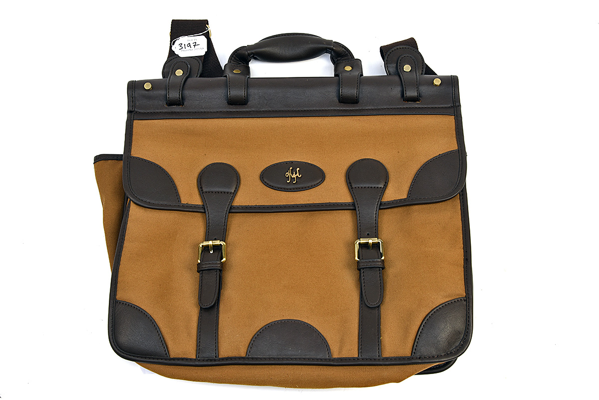 A LIGHTLY USED 'MAREMMANO' CANVAS AND LEATHER BAG, with canvas and leather shoulder strap. with brass initials 'K. H' on lid, brass fittings