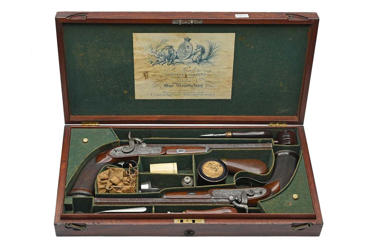 for 1829, with browned slightly swamped 10 1/4in octagonal barrels, the top-flats signed 'I. PURDEY No. 314 1/2 OXFORD STREET LONDON' (mild frosting over addresses), both barrels also bearing Irish registration number EC-1273, dove-tailed bead fore-sights, standing notch rear-sights to the top of the colour hardened breech-blocks, also numbered for the pair, platinum line and vented plugs, fully engraved top-tangs also bearing the pair number, borderline and scroll engraved bar-action locks signed 'PURDEY', bolted safes behind the engraved dolphin headed hammers, walnut half-stocks with swept fully chequered grips and fitted with engraved iron caps, engraved escutcheons to wrists, single set triggers, engraved fore-end caps and no provision for ramrods, strong amount of finish and colour, in their maker's mahogany case lined and compartmented in green baize, parchment trade label inside lid and with a full suite of accessories including loading mallet, cleaning rod, powder flask, wad punch, cap tin, oil bottle and mould